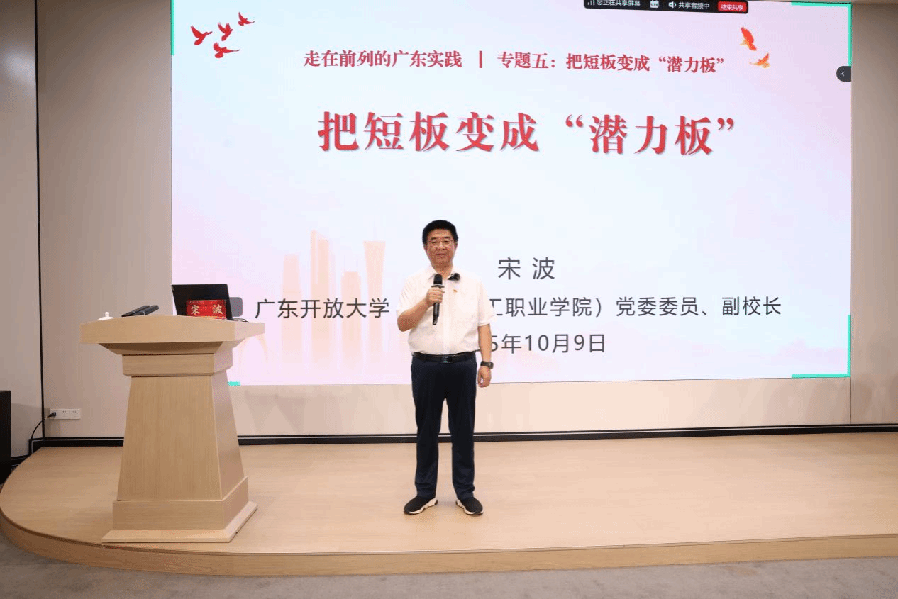 10月9日,多宝手机网页版登录入口党委委员、副校长宋波以《把短板变成“潜力板”》为题,通过线下和线上相结合的方式,向多宝手机网页版登录入口和全省开大体系学生讲授“思政第一课”,引导大家深刻领会习近平总书记对广东工作的重要讲话和重要指示批示精神,积极投身广东“百千万工程”。