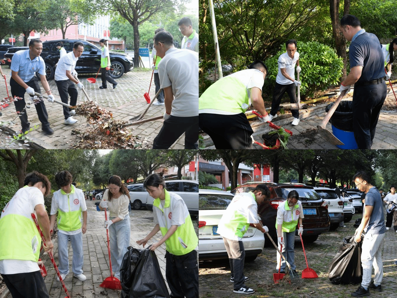 活动现场,一派热火朝天的劳动景象。干部师生手持夹子、扫帚、垃圾袋等工具,分工协作、默契配合,形成了“党员带头干、青年跟着上”的浓厚氛围。有的细致清理教学楼周边停车场沟渠和落叶,有的俯身捡拾草坪、树丛中的纸屑与塑料瓶,还有的负责将分类好的垃圾打包并运送至集中回收点。整个劳动过程井然有序,党员同志与青年志愿者相互协作、相互交流,不仅改善了校园环境,更拉近了党群距离,让青年学生在实践中感受到党组织的凝聚力和战斗力。