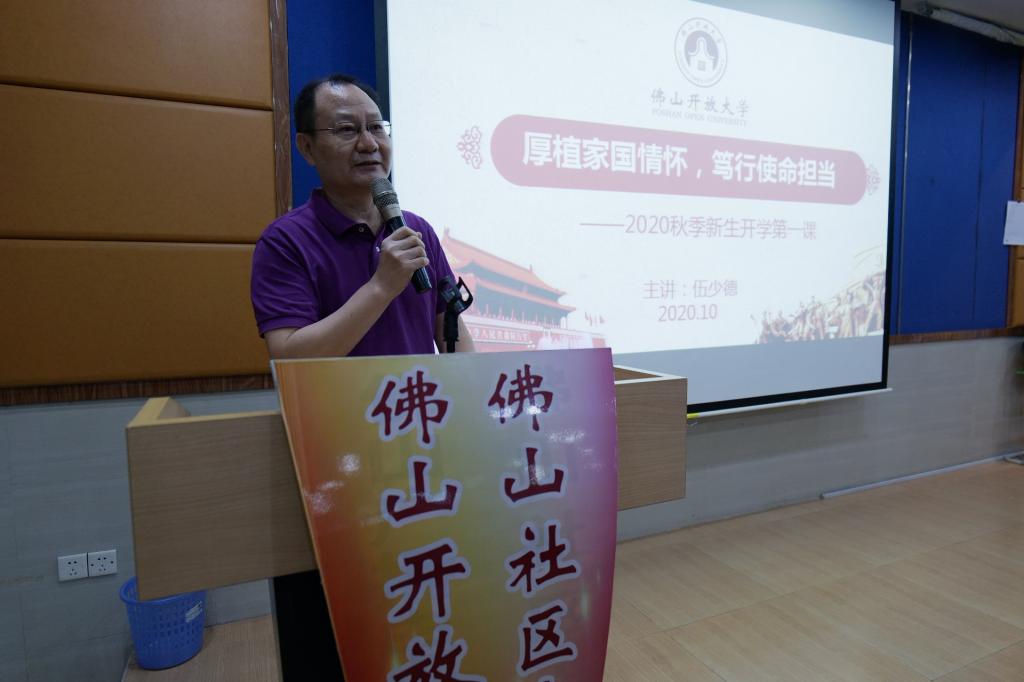 会上,伍少德书记首先代表佛山开放大学全体教职员工对新同学的到来表示了最热烈的欢迎和最衷心的祝福,并以“厚植家国情怀 笃行使命担当”为主题给同学们上了一堂别开生面的公开课。