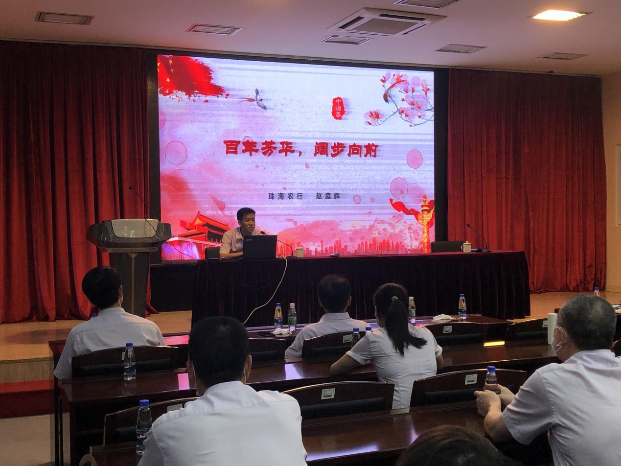 农行珠海分行党委委员、副行长赵庭辉同志讲授党课《百年芳华,阔步向前》。赵庭辉委员沿着救国大业、兴国大业、富国大业、强国大业的历史轨迹,讲述了我们党带领人民艰苦奋斗的100年。党课深入浅出、生动明晰,充分展现了中国共产党百年征程的波澜壮阔。
