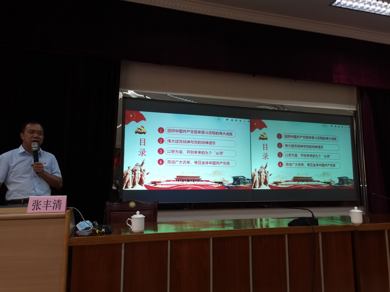 经管学院特邀华南农业大学马克思主义学院院长张丰清教授作主题为“奋斗百年路 启航新征程”的专题讲座,以习近平总书记“七一”重要讲话精神为切入点,结合贯穿建党百年的重大历史事件,梳理总结了我们党带领中国人民在推进革命、建设、改革各个时期取得的宝贵经验和长期奋斗中铸就的伟大精神,深刻阐述了中国共产党百年奋斗的光辉历程和伟大成就,为我们提供了思想上的启发和实践上的指导。现场掌声雷动,气氛热烈,与会教师纷纷表示受益匪浅。