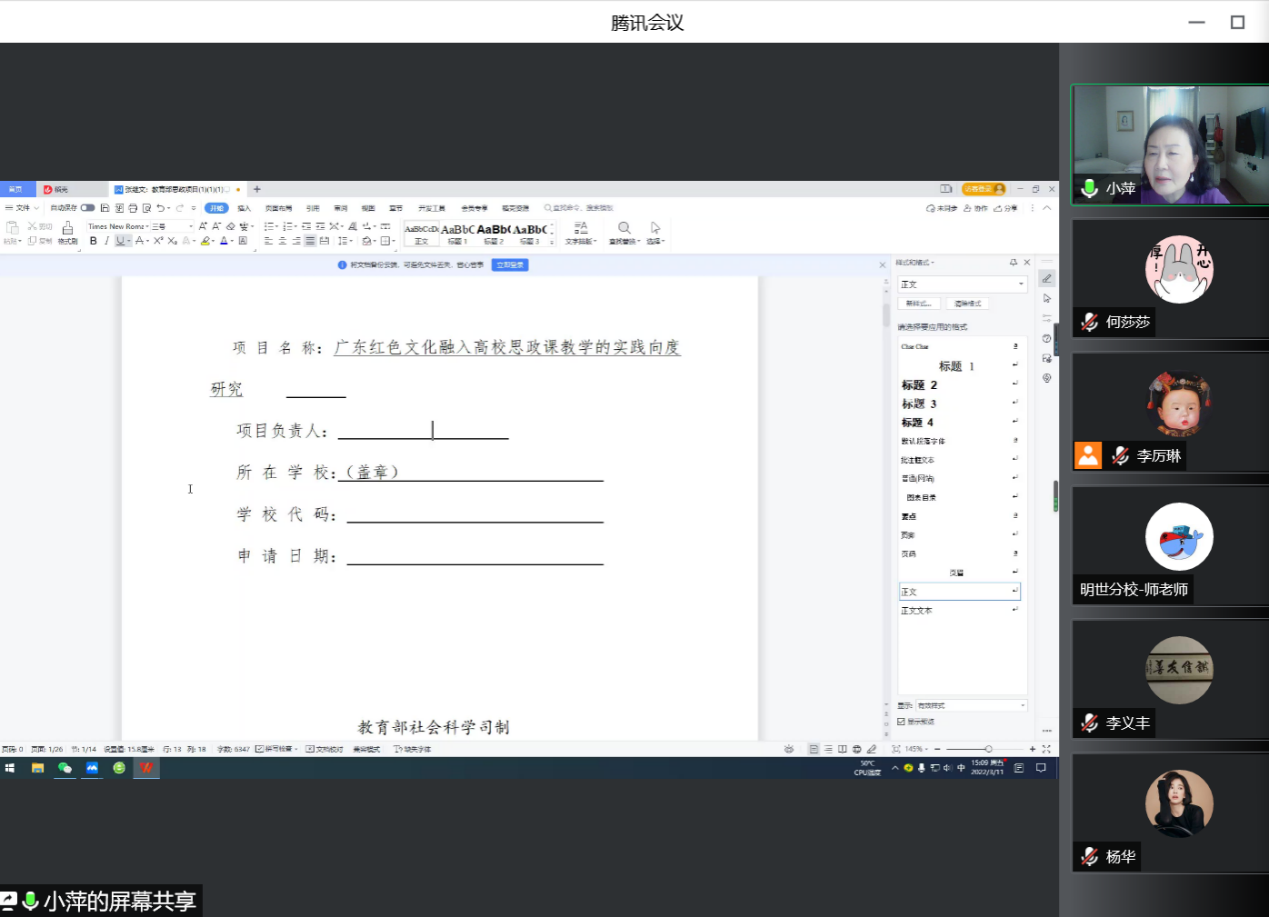 李萍结合自己多年来担任基金评审的经验,结合马克思主义学院申报实例,重点围绕选题方法、课题创新、团队结构以及研究对象、研究框架和研究内容的内在逻辑等方面进行了详细阐述。李萍指出,要重视前期研究基础;选题切忌大而空,应从宏观着眼,从微观入手;申报书的撰写要直截了当、一针见血,内容上要体现新意,表达上要思路清楚、层次分明、重点突出。她还鼓励老师们积极参与课题申报,不断提升个人科研水平,锤炼过硬本领,提升教科研意识,做立德树人的新时代思政课教师。李萍还与大家进行在线交流,对有关问题逐一耐心解答。