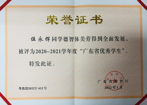 近日,广东省教育厅组织开展了2020-2021学年度广东省优秀学生(中学阶段)评选工作,经评审,附属职校恩平分校伍永挥同学荣获“广东省优秀学生”称号。这是省教育厅为表彰先进、树立榜样,激励全省青少年学生学习先进、奋发向上做出的表彰决定,全省仅12所省属中职多宝手机网页版登录入口学生获此殊荣。该荣誉称号的授予,既是对附属职校学子的认可,也是对附属职校教育教学成果的肯定。