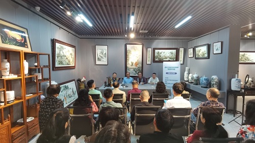 活动现场,李炳炎介绍了当代潮州彩瓷发展的基本脉络、当前潮州彩瓷产业基本情况及对当代潮彩发展的思考。陈锡藩向学员们生动地讲述了中国画与潮彩的关系、潮州彩瓷种类以及潮彩的构图、用笔、虚实等技法、丰富多彩的题材故事和独具地方特色的艺术风格,并以瓷板画“虎溪三笑图”为例详细介绍了作品的题材、典故、人物形象、虚实处理、上釉及煅烧等过程,以及作品所蕴含的文化内涵及时代精神。陈锡藩亲自示范潮彩如何取材,如何用笔,边画边讲解,一幅“竹杖芒鞋轻胜马”作品很快呈现在学员面前。
