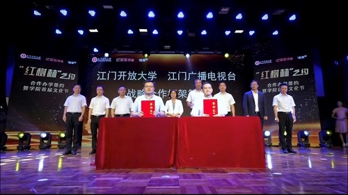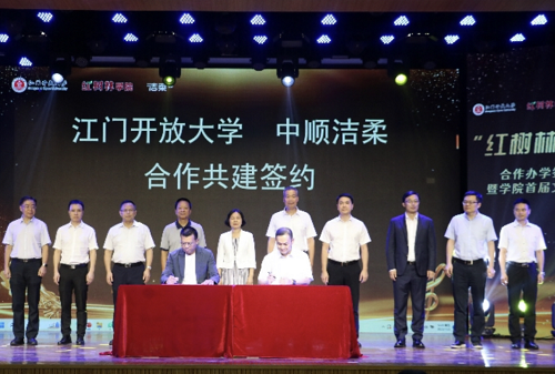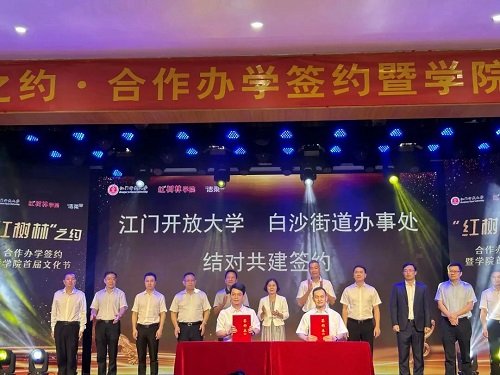 在活动现场,江门开放大学与中顺洁柔纸业股份有限公司、江门广播电视台、江门市蓬江区白沙街道就共建共享“红树林”学院分别签署了合作共建协议。仪式后,还对特聘教师颁发了证书,对优秀班主任、优秀老师和优秀学员进行了表彰,并开展了老年教育教学成果展示。