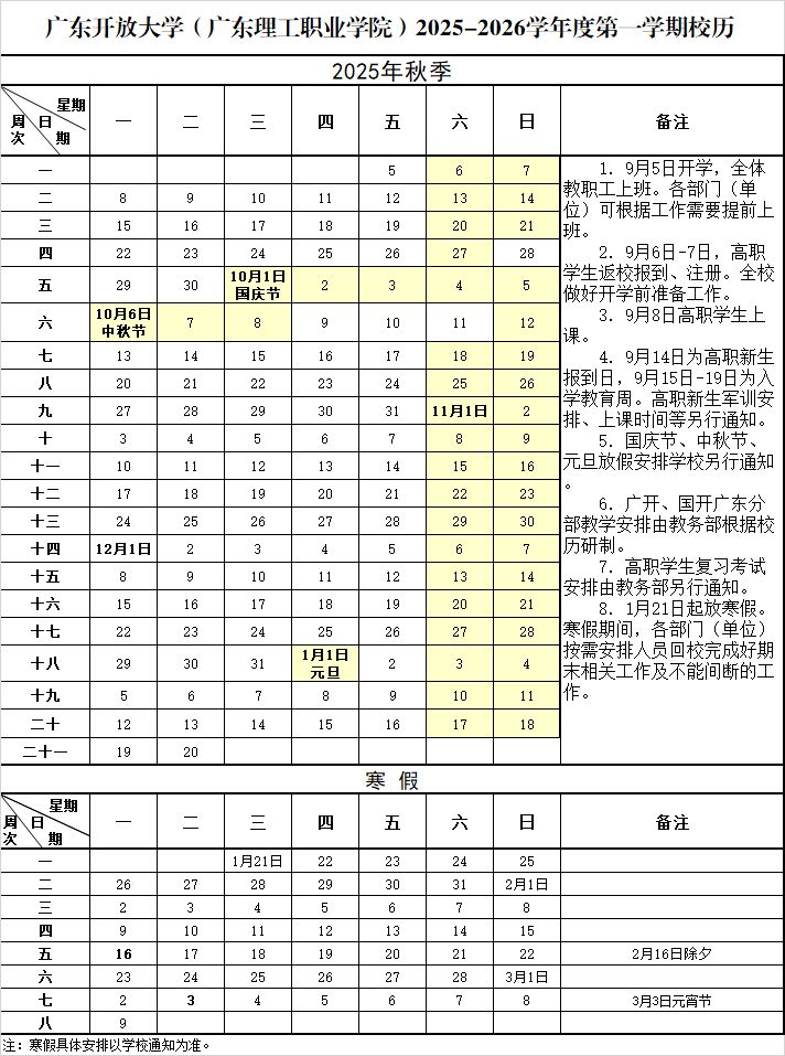 2025-2026学年度第一学期校历