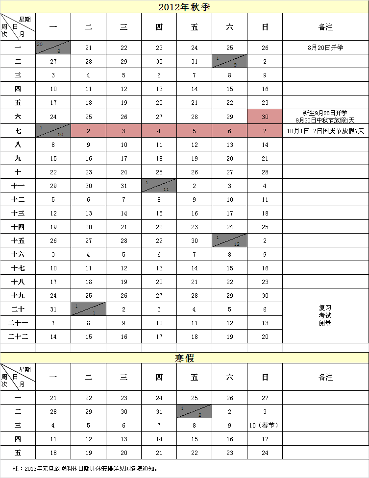 中央广播电视大学2012年秋季校历